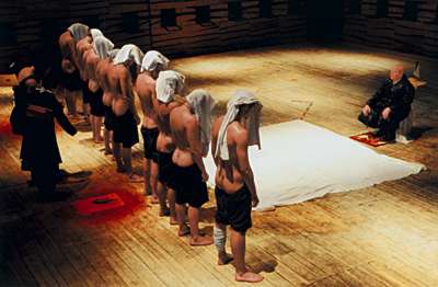 спектакль делался жесткий, о войне, воинах и человеческом мясе, которым война питается. было много открытий, фишек в спектакле. зрители сидели в одиночных дощатых клетках и смотрели спектакль через широкие щели между досками.