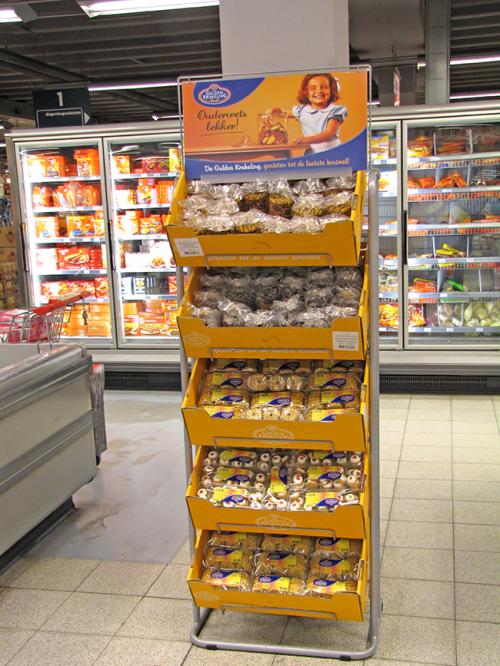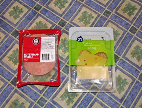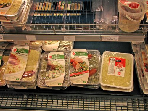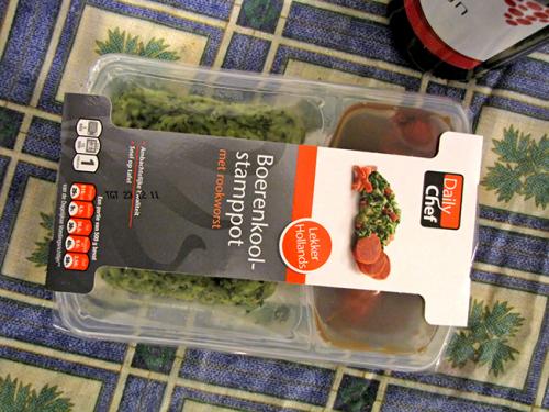 В продуктовом магазине, сразу теряешься, от обилия продуктов и названий на голландском языке. Изъясняясь на своем корявом английском с красивой мулаткой, пытаюсь сказать, что мне нужны традиционные голландские продукты. Она улыбаясь, понимающе закивала головой и подвела меня к полкам, где лежали запечатанные коробочки, потом к лоткам с овощами и показала стеллаж с выпечкой. Из овощей, это оказался цикорный салат Витлуф, который я не рискнул брать из-за незнания с чем, и как его надо есть. Выпечка также ничего особенного из себя не представляла — печенья, пирожные, кексы. А в коробочках действительно оказалось традиционное голландское блюдо «stamppot» (на упаковке еще — надпись «Lekker Hollands», что-то вроде «Голландский вкус»), представляет собой картофельное пюре с овощами и рядом сарделька в остром соусе. Цена — 3,69 евро.