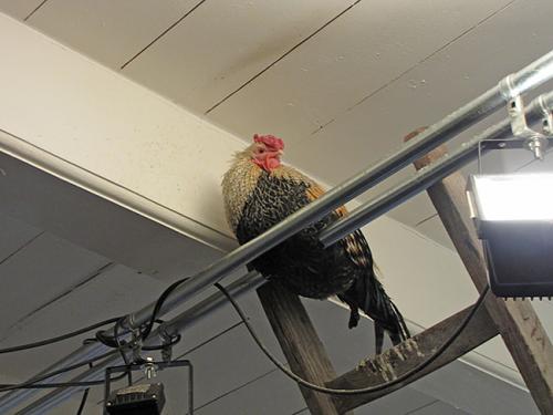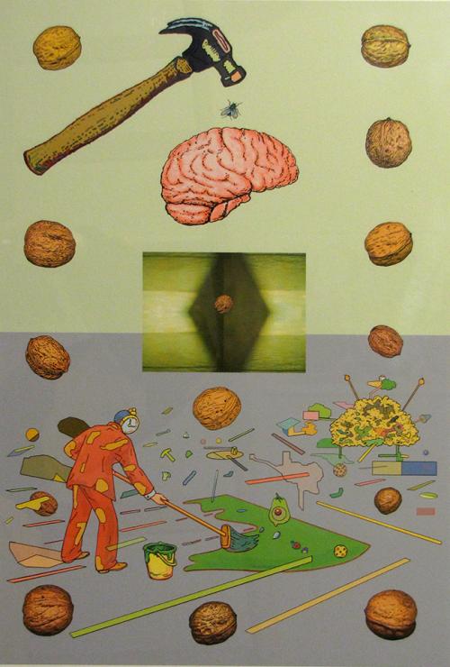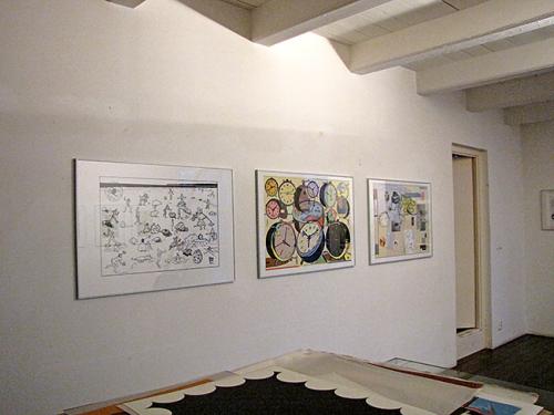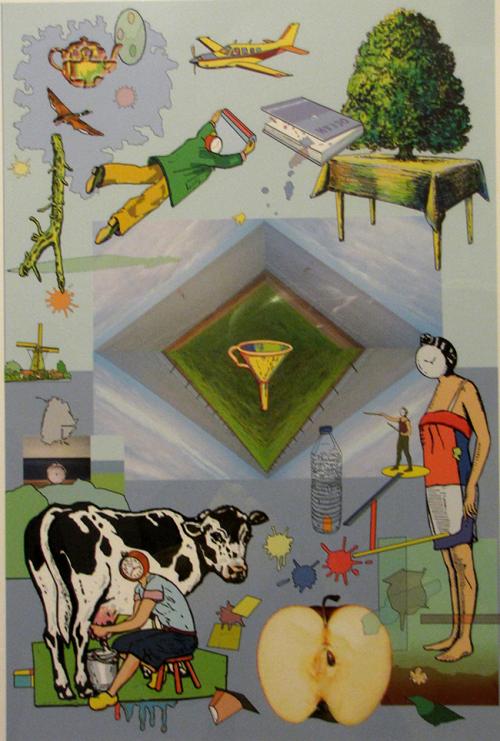 Флюксус — это международная сеть художников, композиторов, дизайнеров, которые смешали все художественные средства в своем творчестве. Зародилось оно в далекие 60-е и вот существует и по сей день. Помимо картин на стенах, они лежат еще на столе и беспорядочно разбросаны по полу. Из под потолка, сидя на жердочке и склонив голову, внимательно наблюдает живой петух.
