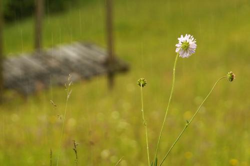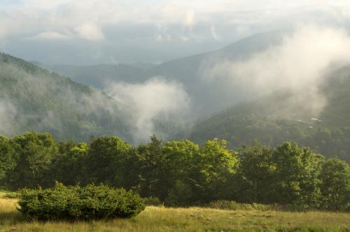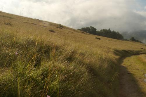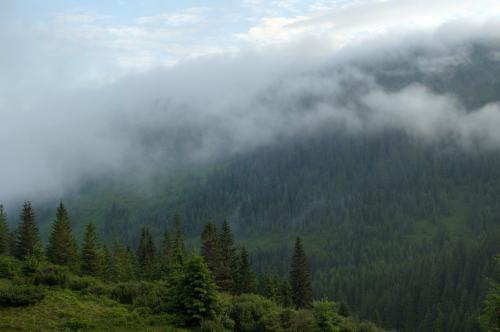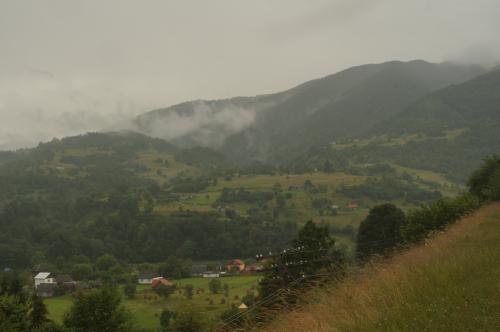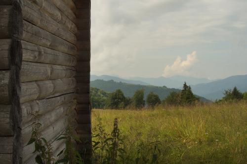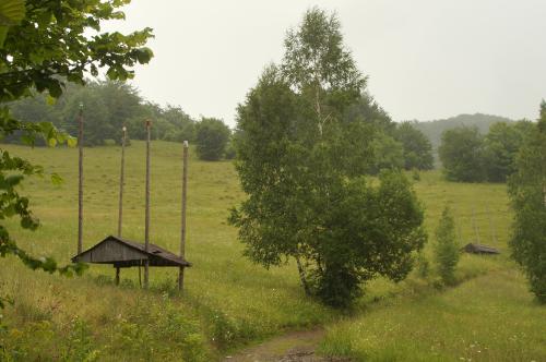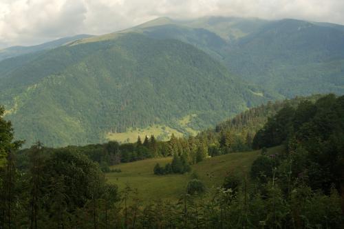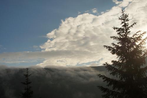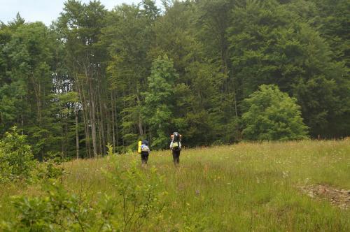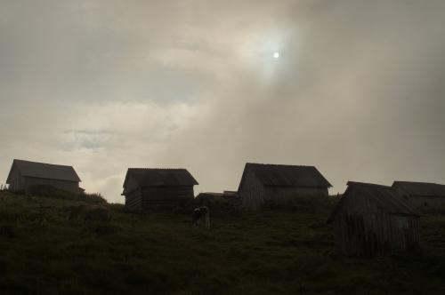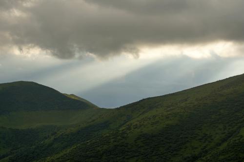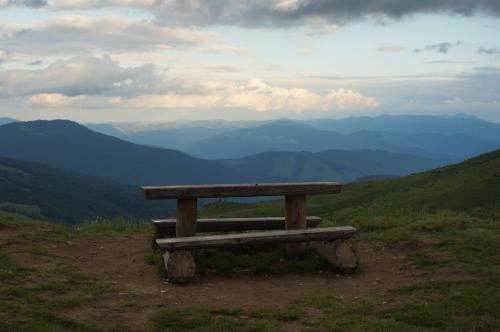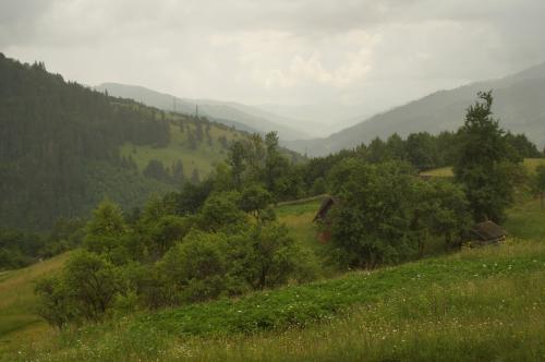 Тут на перевале обзор в разные стороны и ощущаешь себя богом погоды: на юго-западе закат и дымящаяся колыба вдалеке на полонине, а на северо-востоке идет дождь, и О, мама-мия движется в мою сторону со скоростью поезда. Надо поспешать. Мелкие камни набили стопы, но я уже не замечаю. Через пол часа пошел ливень и начало вечереть. Спустился еще несколько метров и увидел на небольшой поляне деревянный навес. Отличное сооружение для всех путников, которых застала в дороге непогода и ночь. Конструкция из трех стен, наклонной крыши и пол-навес внутри над землей. Часть крыши была абсолютно целой и хорошо держала дождь. Здесь и заночевал, развесив мокрые вещи на перекладине. Ночью слушал сову и вой волков - романтика аднако. Прохлада пришла под утро.