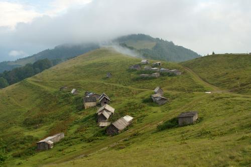 Дошел я до перекрестка, где стоял домик для путников и большой деревянный стол с лавочками. На указателе было два села и полонина Шешул. Моих Квасов не было, куда идти не понятно, аж три дороги. Решил спуститься к коровникам на полонине и повстречал гуцулок.