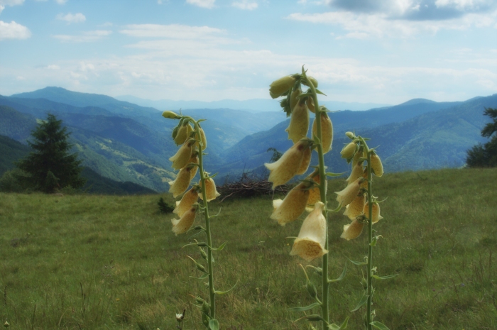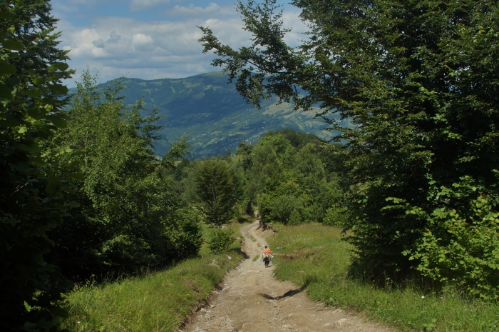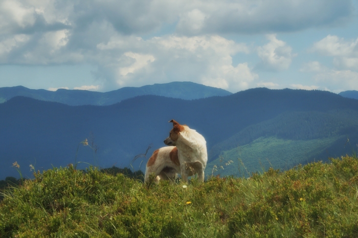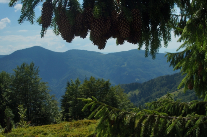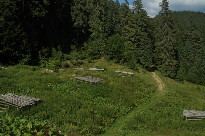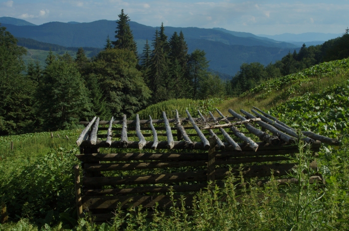 Отсюда в Румынию рукой подать. И пока шел по хребту к вершине Менчула по мобиле пришла смс-ка: лайф приветствует за кордоном Украины... Меня ждала абсолютно пустая мало хоженная дорога через лес вдоль мистической вершины древнего Менчула. По дороге наткнулся на кустарниковый можжевельник с очень сладкой нетерпкой ягодой и тонким запахом элитных французских духов. Крымский можжевельник более резкий по запаху и по вкусу терпкий. Целые плантации черники и чабреца, рай, чего хошь выбирай. Впереди место для съемок какой-нибудь фантастики - деревянные клетки с крапивой в человеческий рост, бывшие брошенные коровники.