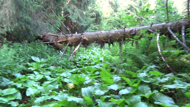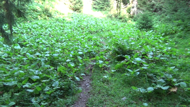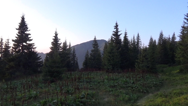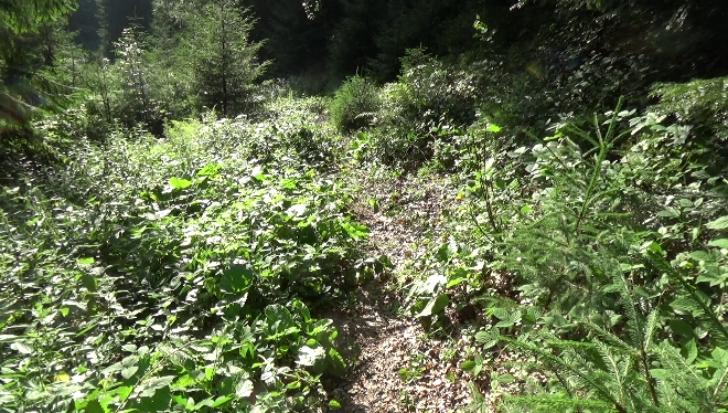 На одной из полянок наталкиваюсь на 3-х человек, один из них гид. Он то мне и показал правильную тропинку на Стрымбу. Моя же широкая дорога уходила влево вдоль реки и скорее всего заканчивалась где-нибудь в урочище под горой. То есть без гида я бы не попал на гору так легко. Тропинка оказалась горной узкой, периодически исчезающей, Но гид подсказал ориентиры, которых я должен придерживаться, это лавочка возле источника и три лопуховых полянки по пути, которые чередуются с лесом. Когда идешь один первый раз по незнакомому лесу, эти подсказки помогают даже очень, ибо тропинка часто разходилась и можно зайти в такие хащи, что будешь выбираться день.