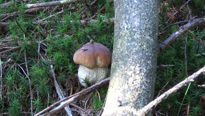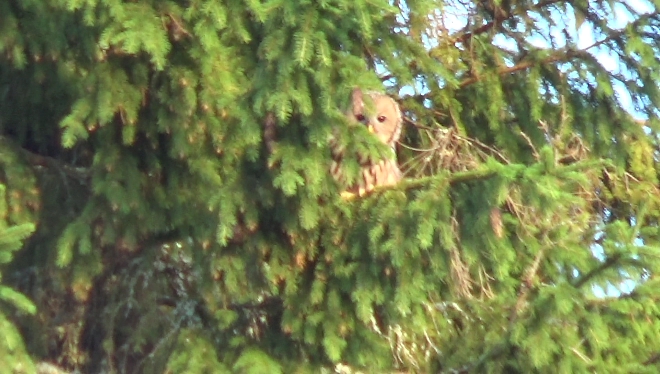 Дорога была интересной, постоянно петляла с набором высоты и приближала меня к вершине. Елки здесь попадались очень древние, больше метра в обхвате ствола. Лес сухой хвойный, мох, черника и глубокий вяжучий запах. Вышел на очередную полянку и бац птица слетела и села на ветку елки. Камера у меня наготове, моментально навел на качающуюся ветку и Эврика - Сова, первый раз в живой природе встретил сову.