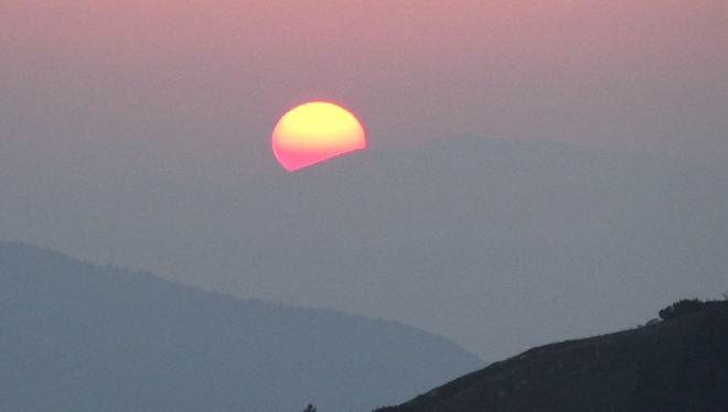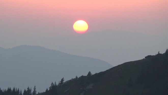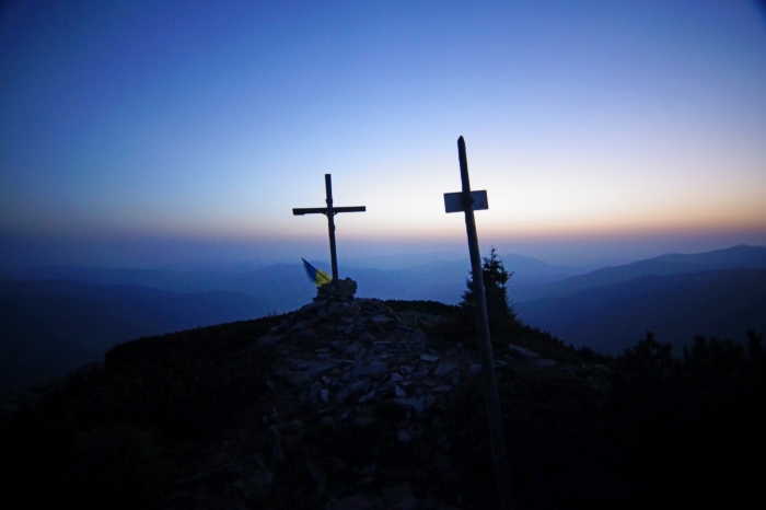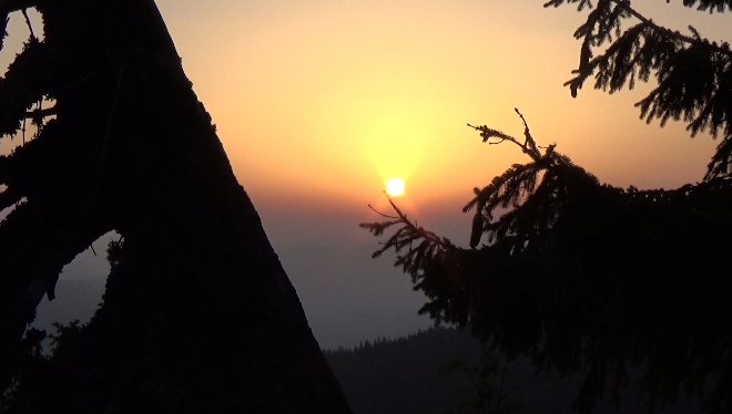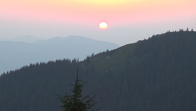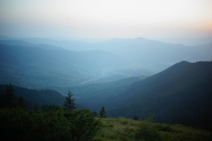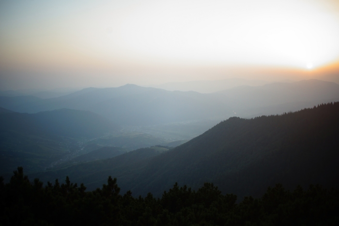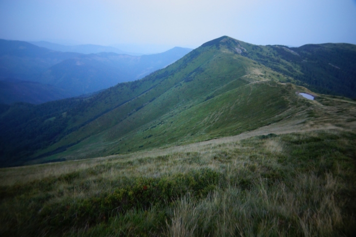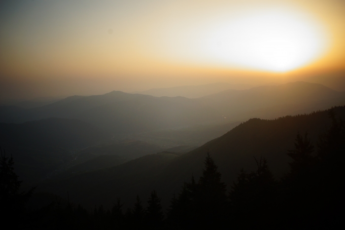 Солнце стремительно уходило на запад за хребты соседних гор, и тональность заката больше напоминала горы Юго-восточной Азии, чем Закарпатье. Опоздай я минут на 10-15 и не снял бы эти моменты, солнце буквально каждую минуту уменьшалось в размерах. В этот момент я благодарил деда с жигулями, именно он помог значительно сократить время старта от магазина, и я встретил гида за 50 метров от нужной тропинки, без этих 2-х обстоятельств я бы не попал на Стрымбу. Вот так небо мне подсобило. Дальше тропинка шла по траверсу и вывела на седловину между двумя вершинами одной горы Стрымба и Стреминос.