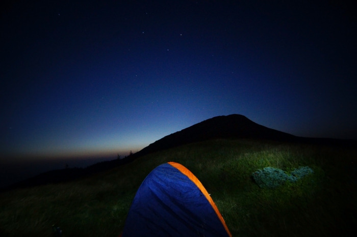 Спускался уже в сумерках, темнело быстро, а еще палатку ставить. На седловине появилась косуля, но камера не взяла, слишком темно. Пока ставил палатку облепили комары, но, не злые, кусали незаметно. А когда делал ночные снимки, атаковала ночная мышь. В общем, Стрымба встретила гостя прилично.