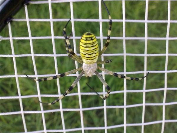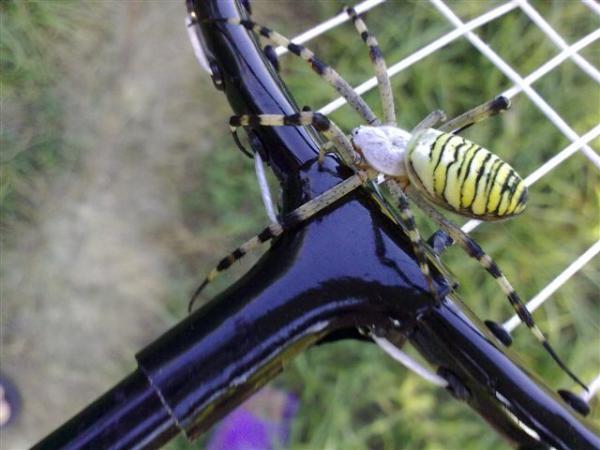 Когда мы подставили ракетку от бадминтона,паучок неожиданно выпрыснул жидкость,благо успели отскочить...
