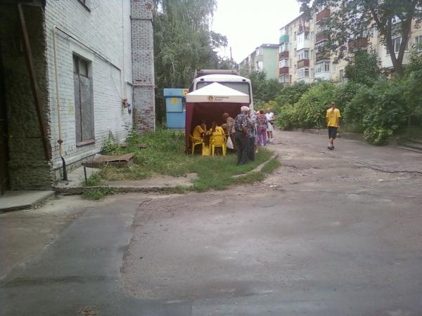 Сегодня во двор моего дома приехал автобус с логотипом "Громадська думка". Поначалу внимания не обратил, ну приехал и приехал. Минут через пять люди в футболках также с логотипом "ГД" выставляют свою палатку возле которой через минут 10 появились первые бабушки. Интерес берет верх, выключаю телик и спускаюсь вниз.