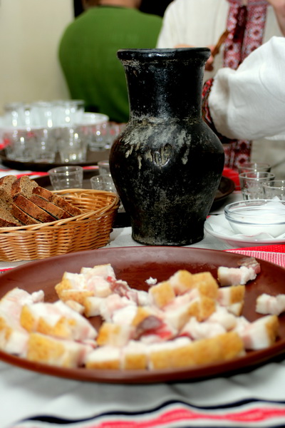 Так мы встречали гостей. Пришедшему в дрескоде предлагалось отведать сальца и махнуть рюмаху)