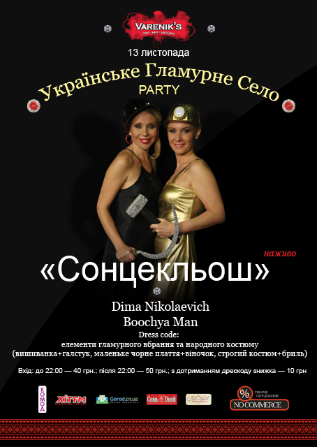 13 ноября, в 21:00 в Varenik's Pub состоится концерт интнресной украинской группы "Солнцекльош". Концерт состоится в рамках вечеринки Украiнське Гламурне Село".