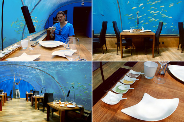 - Подводный ресторан (на Мальдивах). В отеле Hilton во время трапезы с вас не будут спускать глаз акулы, скаты и прочие морские обитатели. Ведь первый в мире полностью остекленный ресторан расположен на глубине пяти метров на коралловом рифе. Кажется, что разглядывая захватывающий мир вокруг, кушать вовсе не захочется, да и рыбок станет жалко…