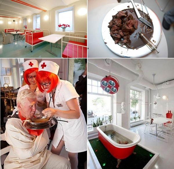 - Ресторан – госпиталь (Рига) на все 100% смахивает на медицинское учреждение – вывеска Hospitalis, медсестры вместо официанток, аптека вместо бара, операционный стол вместо обеденного. В “Госпитале” сполна чувствуешь себя “на больничке: у входа на вешалке висят настоящие больничные байковые халаты, со стен смотрят рисованные портреты медиков, стоят старые медицинские весы, капельницы, по телевизору показывают фильмы о больницах и врачах, а столы условно называются врачебными кабинетами: зубного врача, гинеколога, реанимация. Блюда подаются на белой, как в больнице, посуде со штампом, а за обед клиенты расплачиваются конвертами с надписью «Благодарность»))). В подвальном помещении – зал в красных тонах, именуемый «психушка» – банкетный зал с обитыми мягкой кожей стенами и петлёй-удавкой, свисающей с потолка. Меню в этом ресторане называется «сумасшедшее», а бонусом к некоторым блюдам идёт смирительная рубашка и кормление с ложечки. Местечко не для слабонервных!