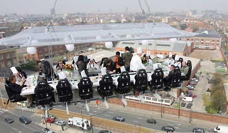 - Пообедать на высоте 50 метров над землей предлагает ресторан Dinner in the Sky «Обед на небесах» в Брюсселе. Всего за столом могут разместиться 22 человека, не считая трёх поваров, официантов и конферансье. Всю эту компанию вместе со столом, навесом, светильниками, креслами с ремнями безопасности доставляет в «небо» подъемный кран… Общий вес «ресторана» примерно 2,2 тонны. Обед на небесах…ммм, чищу перышки, точу лыжи.