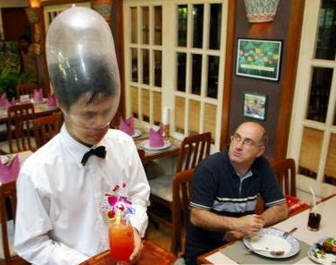 - В тайском ресторане Cabbages and Condoms официанты, когда разносят коктейли, надевают на голову презерватив. И как они, бедняжки, дышат?