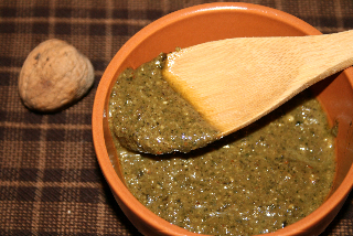 На несколько сибасов (это может быть любая "похожая" рыба) нам нужно сделать песто: базилик листиков двадцать, 100 грамм пармезана, лимон, соль, свежемолотый черный перец, оливковое масло, несколько грецких орехов и, если хотите, зубчика три чеснока.