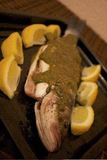 Очищенную рыбу надсекаем ножом вдоль (неглубоко!), активно натираем базиликовой смесью снаружи и внутри и даем минут двадцать помариноваться.