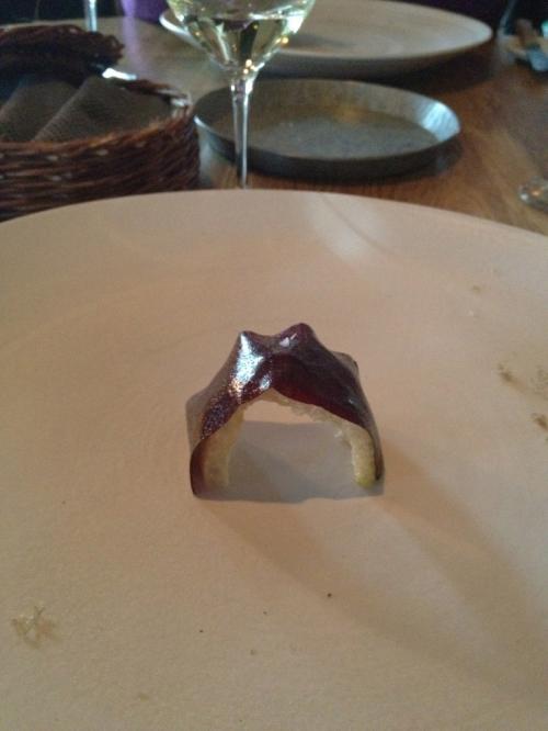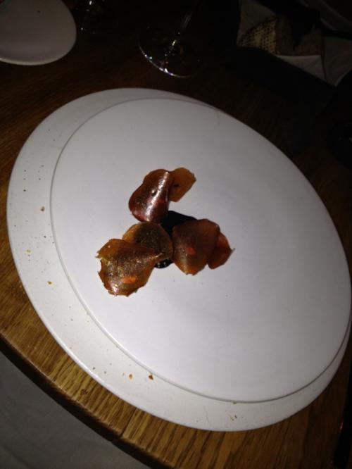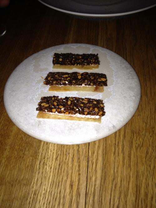 После этого нам принесли сушёный мох. Слово «мох» нам было по-английски не понятно, тогда официант объяснил нам, что то, что мы будем сейчас есть, растёт на деревьях у земли с северной стороны. Мох я не успел сфотографировать, потому что его было очень мало, он сильно крошился, на вкус оказался горьковатым, как будто нам дали погрызть высушенных до невозможности опят. Но если наберёте в интернете название этого ресторана — там есть фотография мха. Это вообще у них фирменное блюдо.