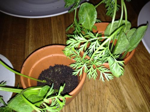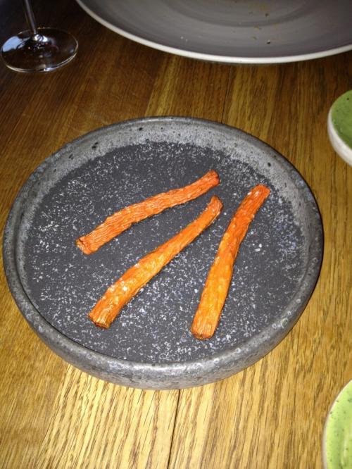 Как вы думаете, что это? Мы тоже сразу не догадались. Но каждое «блюдо» сопровождал новый официант с восхищённым рассказом о том, что это и как было исполнено. Так вот — это сердцевина морковки, которую восемь часов томили в печи при температуре 50 градусов. При этом, в печи находилось ещё что-то, что сообщило высушенной моркови вкус лыжной мази. Есть это нужно было следующим образом. Надо было обмакнуть морковку в специальную жидкость, и обвалять в том чёрном порошке, очень похожем на землю, на котором она лежала. Я попробовал без этого и с этим — стало только хуже… Поедая эту дрянь, мы уже очень веселились.