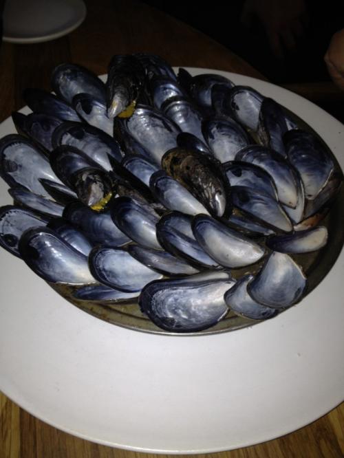 Когда принесли следующее — мы обрадовались. Но радость наша была недолгой. Обрадовались мы потому, что нам принесли большую тарелку с мидиями. Официант дал нам порадоваться, а потом сообщил, что мидий здесь никаких нет, а есть только пустые их створки, но среди пустых мы можем найти три маленьких закуски в виде мидий, у которых раковинка съедобная. Мы наши эти три съедобных раковинки и съели их, не поняв что оказалось в нашем организме, и из чего это состоит. Благо, этого было ничтожно мало.
