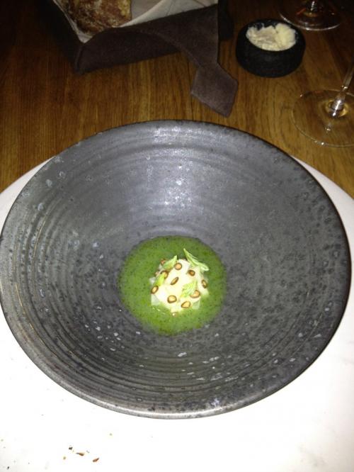 Видите? В глубокой супной тарелке на дне зелёная масса с чем-то беленьким? Тарелка большая, а то, что на дне — может поместиться в столовой ложке. Думаю, что зелёная масса — это некий мусс из свежей хвои лиственницы с лимонным соком. А беленькое мы не смогли идентифицировать. По консистенции похоже на измельчённую крабовую палочку, но только с совершенно непонятным медицинским вкусом.