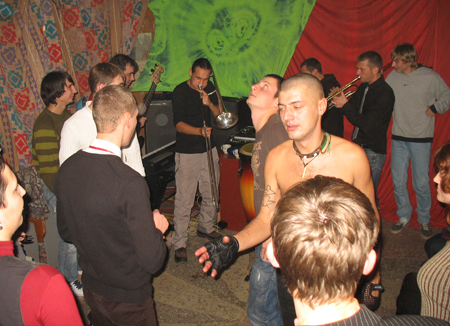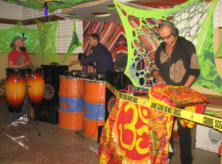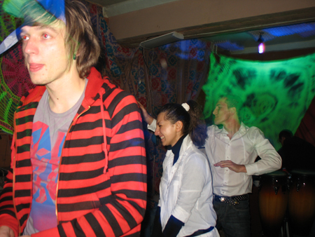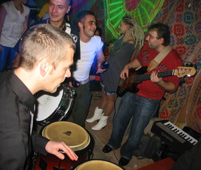 Крупнокалиберный "изюм" трансового вечера, плавно перетекшего в ночной джангл-шмангл-и-ещё-что-то-там воплощала (помимо нервно реагировавшего на повышенное внимание симпатичных девушек к моим картинам московского ди-джейчика) четвёрка местных шаманов винила (вот их сценические псевдонимы: DJ Lucky, DJ Chip, DJ Shorty, DJ Stupen4ik), а также снискавшая себе изрядную популярность в местной клубной тусовке джаз-рок группа "Jam Bubble band".