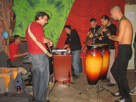 Особая эксклюзивная прелесть этой пати заключалась в следующем. Любой желающий мог сначала зайти в студию, где играет группа и пропустить через себя несколько сот вольт пьянящей, тягучей, неочищенной джаз-рок энергии, а потом, сделав пару шагов, окунуться в пульсирующую атмосферу данс-холла, взвихрённую ди-джейскими камланиями. Можно было и наоборот: из "диджейни" в "джазовню". И так всю ночь.