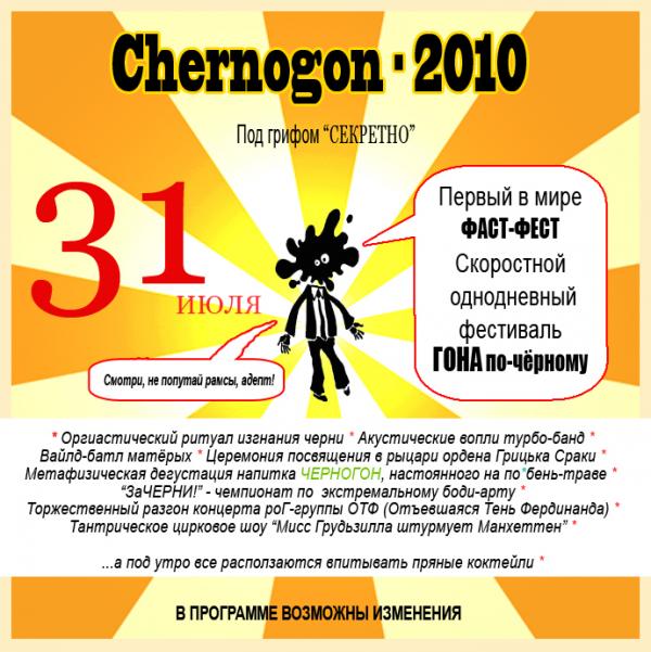 ... 31 ИЮЛЯ ЧЕРНОГОН УДАРИТ ПО ЦЫМБАЛАМ ... 31 ИЮЛЯ ИЗБРАННЫЕ ПРОЗРЕЮТ ... У ОСТАЛЬНЫХ В ЭТОТ ДЕНЬ ОТ ГОНА ПОТЕМНЕЕТ В ГЛАЗАХ ... ИБО ЧЕРНОГОН ПОХОЖ НА ВЗРЫВ ЛАЗЕРНОЙ ВИДЕОГРАНАТЫ СРЕДИ ТОЛПЫ СТАЛЬНЫХ ЛЮДЕЙ С АЛМАЗНЫМИ ГЛАЗАМИ ... ЕСЛИ ВАС ТАМ НЕ БУДЕТ, СЧИТАЙТЕ, ЧТО ПОВЕЗЛО ...