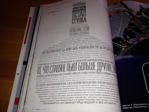 Общее впечатление от журнала – не такое плохое, как я себе представлял, прочитав некоторые отзывы. Но и не ах. Многие справедливо критиковали украинский Esquire за слишком малое количество своего контента. Это да, согласен, маловато. Процентов 70 взято у российского брата.