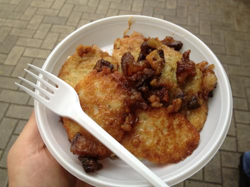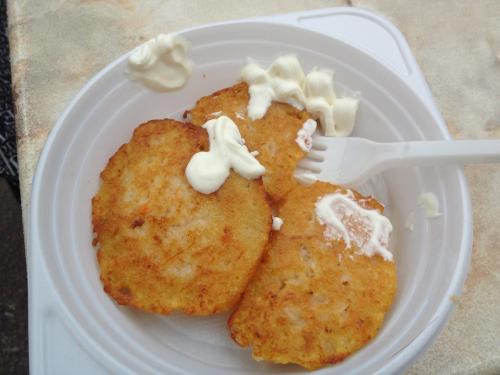 Дерунов было съедено четыре порции. Больше тупо не смог. На фото три из них. Деруны были всякие, но в основном трех видов: простые со сметаной, со шкварками, и с мясом. Стоимость порции варьировалась от 5 до 20 грн.