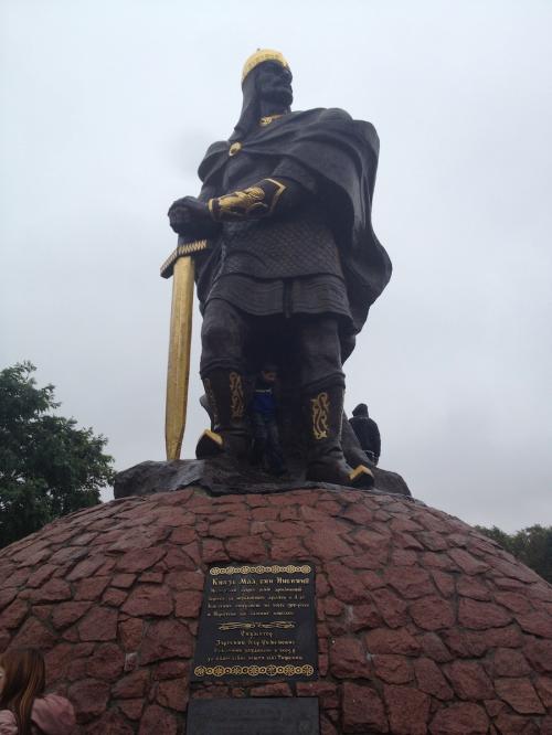 Это памятник древлянскому князю Малу. Ну, тому самому, которого порешила княгиня Ольга в отместку за убийство мужа. Вообще своими древлянскими корнями местные жители очень гордятся. И тема Древней Руси широко представлена в многочисленных памятниках и статуях. Памятник Малу выглядит монументально. Как написано, сооружен он был на деньги "вдячних нащадків". Примерно такой же, кстати, текст на многих табличках к памятникам. То есть граждане проявляют недюжинную патриотичность и социальную ответственность. Когда увидел это памятник, сразу вспомнил собственные рассуждение в одном из недавних постов на тему памятников вообще и монументу Мстиславу Храброму в частности, как одному из величайших черниговских князей. Нету. Как нету и памятника Антонию Печерскому и многим многим другим достойным персонажам черниговской истории.