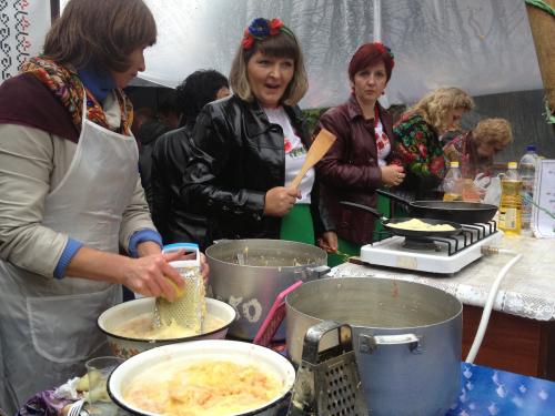 Мер города и какой-то неизвестный мне нардеп жарили деруны и угощали горожан. Мер, насколько я понимаю, и есть главной движущей силой этого события.