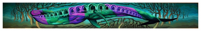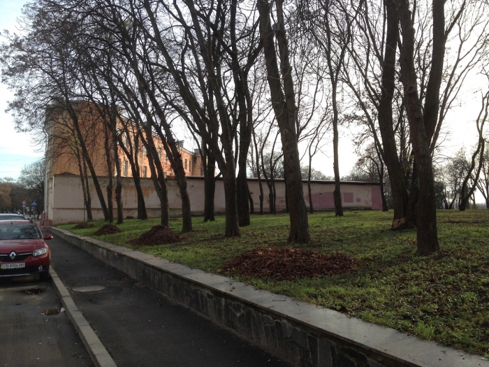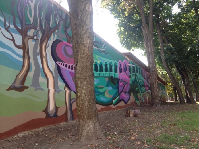 Еще была задача обыграть деревья, потому что особенность этой стены в том, что она просматривается с любой точки только сквозь парк. Поэтому на мурале присутстуют деревья, как продолжение парка. Такая легкая оптическая иллюзия. Думаю, особенно хорошо эта стена будет смотреться и радовать глаз слякотной поздней осенью и особенно зимой, когда выпадет снег.