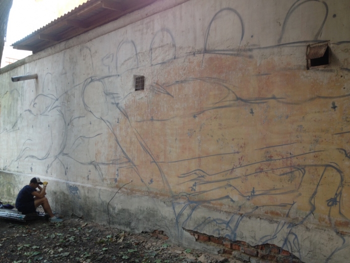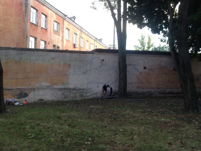 Года четыре назад появилась идея сделать эту стену. Почему эту? Ну, во-первых, она кайфовая. Во-вторых, это центр города, и хотелось превратить реально позорного вида забор в какой-то арт-объект. В-третих, это забор истфака (а сйчас Института истории), альма-матер так сказать. Ну и в-четвертых, хотелось, чтобы в городе появился хотя бы один большой настоящий мурал.