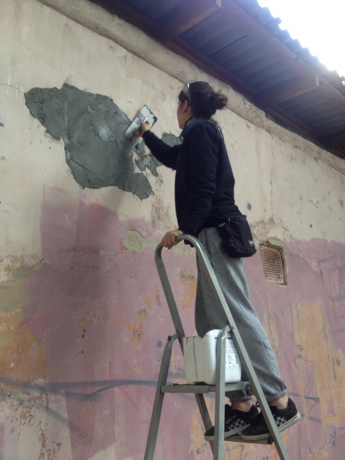 Это та самая Вита. которая уехала еще до окончания работ. Художественная идея её. Делает несвойственную ей работу. Потом наняли маляров, и подготовка стены пошла быстрее.