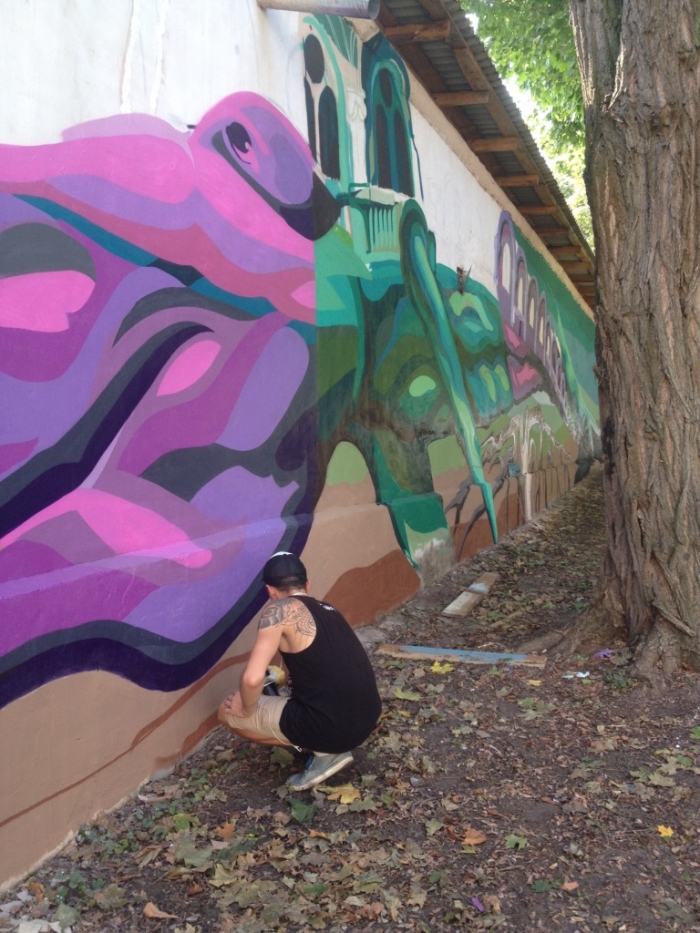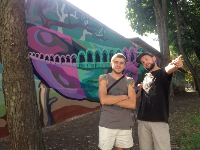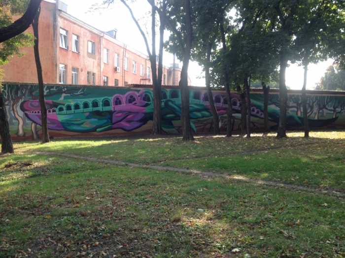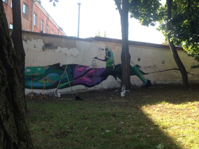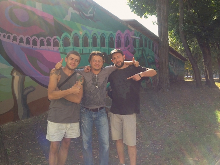 Складывалось всё непросто. Много переговоров: и с художниками, и с администрацией, и с другими заинтересованными лицами. Стенка многих интересовала теоретически. Но то никак не могли найти время в графике, то с эскизом не сросталось, то еще какая-то хрень. Но потом раззнакомились с Андреем Зоиным, который делает фестиваль RespubliсA в Камянце. И вообще он пионер-передовик в этом движении, сделал из своего родного Камянца-Подольского целый стрит-арт-город. Вот Андрей и посоветовал мне этих парней из Луцка – команду Magic Art Group.