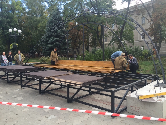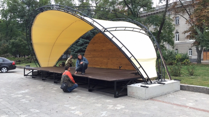 Поставить небольшую крытую сцену на Аллее Героев мы просили уже года три. Слишком много Зелёных сцен отменилось из-за дождя, слишком сильно влиял на выступления артистов фактор погоды. И вот она стоит. Построенная за городские бюджетные деньги, которые были выделены ещё в марте. Процесс проектов/экспертиз/конкурсов-шмонкурсов/изготовления затягивает страшно. Но тем не менее её сделали. Сделали ребята из нашего политеха. Последние 2-3 месяца этот проект был для них настоящим челенджем. Сцена ещё не на 100% доделана, есть огрехи, которые нужно будет подтянуть. Скажу честно, эта сцена предельно проста и далека от моего идеала, как по форме, так и по исполнению, но она есть, и это уже круто. Это компромисс при минимальном финансировании. В процессе изготовления проекта было внесено много корректировок, не всегда улучшающих внешний вид конструкции. Её плюс в том, что она «не зарыта» в землю, а просто стоит. Два бетонных блока по бокам фиксируют несущие части конструкции. И если когда-нибудь её нужно будет разобрать и переместить в другое место, то сделать это можно будет достаточно легко.