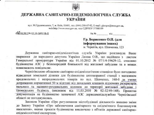 Когда на брифинге я задал вопрос о том согласован ли проект землеотвода с органами внутренних дел (с ГАИ) представители компании заявили что слышат впервые о необходимости такого согласования, - уверен их юрист откроет " Правила розничной торговли нефтепродуктами", где сможет прочитать норму, которая гласит, что "У всіх випадках місце розташування АЗС визначається органом місцевого самоврядування та погоджується в установленому порядку з відповідними органами внутрішніх справ та територіальними органами Мінприроди." Если ознакомятся со статьей 198 Земельного Кодекса узнают, что проект землеустройства необходимо было согласовывать со смежными землепользователями, а если откроют "Временный порядок использования территории г. Чернигова ", а не утратившие свою силу "Правила застройки и использования г. Чернигова", то увидят что зона, где они собрались строить свой объект повышенной экологической опасности относится к зоне Ж-1 и согласно новому порядку, в отличии от старого строить заправку в этой зоне им не поможет даже специальное разрешение, которое может быть выдано только для строительств