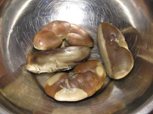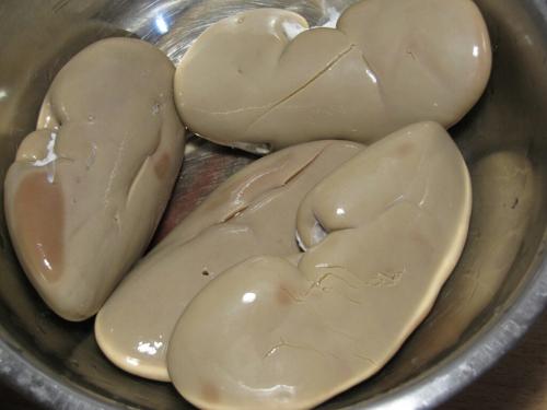 Про почки стоит рассказать отдельно. Учитывая специфику назначения сих органов, обрабатывать их тоже нужно по-особому. Сначала обрежем весь жир и пленки, зальем водой и оставим на сутки в прохладном месте. Воду каждые два часа меняем (ночью конечно не надо) а в последний раз добавим в воду немного уксуса. Потом отмоченные почки промываем, кладем в кастрюлю, заливаем водой, доводим до кипения, воду сливаем. Повторить три раза. Накипь нужно снимать постоянно. После этого почки снова заливаем водой и варим часа полтора. После чего охлаждаем и нарезаем кусочками. В процессе варки почки ужмутся раза в два, как говорится, feel the difference.