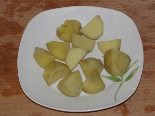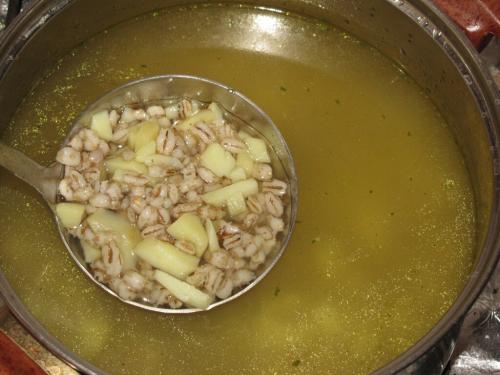 4. Бульон кипятим, кладем в него перловку и картошку.