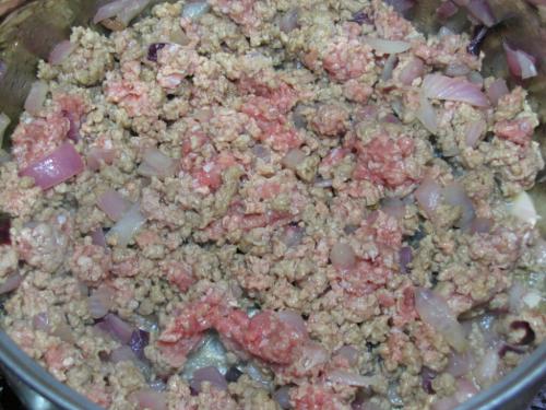 2. Добавляем фарш и обжариваем на сильном огне. Постоянно помешиваем, нам не нужна большая тефтеля, мясо должно быть рассыпчатым.