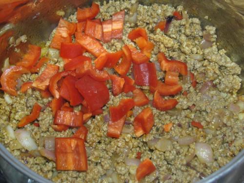 4. Болгарский перец режем кубиками, кидаем в кастрюлю, перемешиваем и слегка обжариваем. В этот момент закройте двери поплотнее, чтобы на запах не сбежались соседи со всего этажа!
