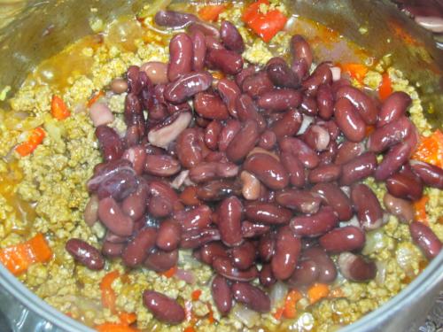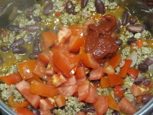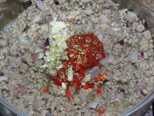 3. Когда фарш обжарится, добавляемм ложку томатной пасты, орегано, растертую зиру, раздавленный чеснок, половину стручка чили. Все перемешиваем.