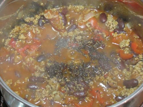 7. Добавляем тертый шоколад, черный перец, вторую половину стручка чили. Тушим еще минут 10, регулярно помешиваем.