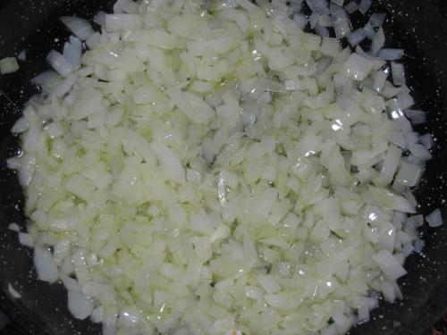 1. Для начала, мелко порежем лук. Не надо его пропускать через мясорубку вместе с мясом, надо именно резать, тогда все соки останутся внутри. На сковородку льем 4 столовые ложки масла и жарим...нет, не жарим. Сегодня мы ничего жарить не будем. Мы будем томить. На небольшом огне, не торопясь.
