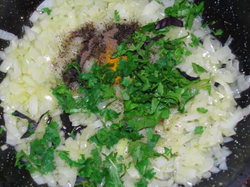 2.Когда лук станет золотистым, добавим к нему специи и мелко порезанную зелень. Перемешаем, чтобы все покрылось маслом.