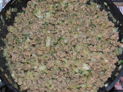 3. Теперь пришла очередь фарша. Его тоже надо томить на медленном огне, пока фарш полностью не поменяет цвет. Очень важно постоянно помешивать, это не даст жидкости выйти, ну и конечно, мы получим рассыпчатый фарш, а не одну большую фрикадельку.