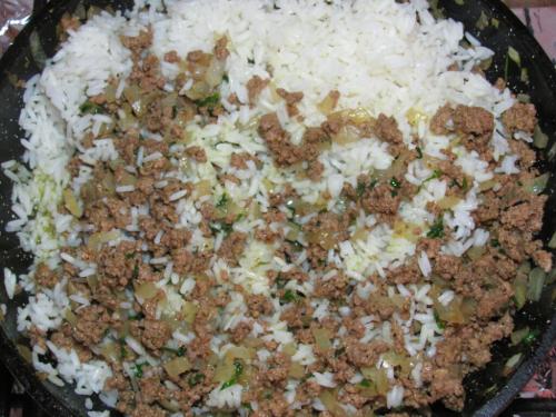 4. Рис отвариваем до полуготовности (это минут 5,не больше) и высыпаем в сковородку, тщательно перемешиваем и держим на маленьком огне еще пару минут. Наша начинка готова.