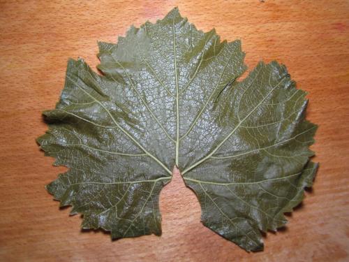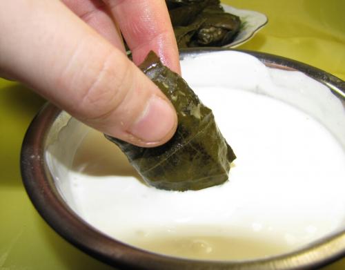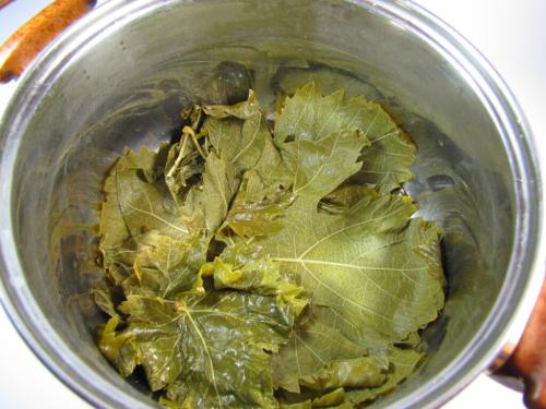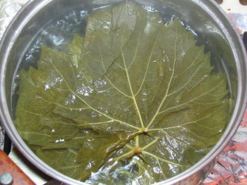 5. Займемся листьями. Для начала их надо бланшировать - поместить в кипяток. Молодым свежим листьям хватит нескольких секунд, маринованные надо держать пару минут. Это размягчит листья, и мы легко сможем их свернуть.