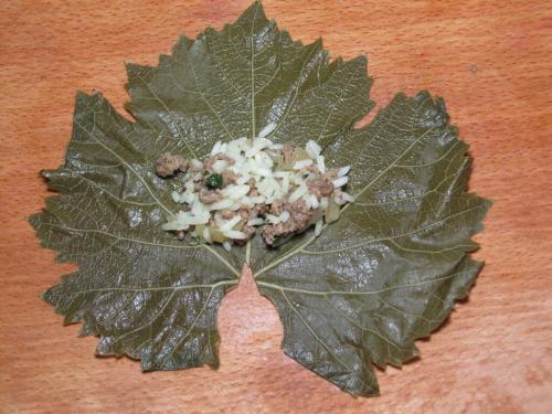 8. Кладем чайную ложку фарша. Больше не надо, во-первых, будет неудобно заворачивать, а во-вторых, это идеальная порция для долмы!