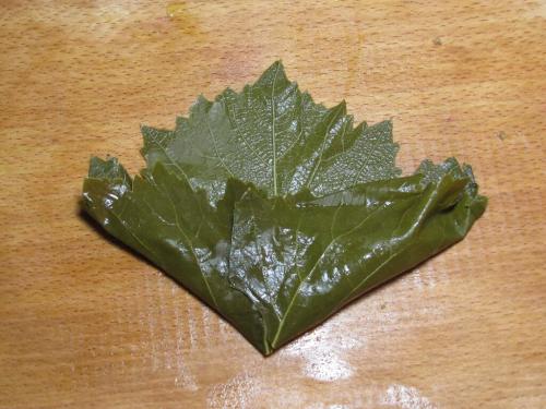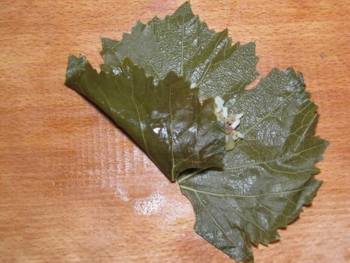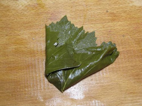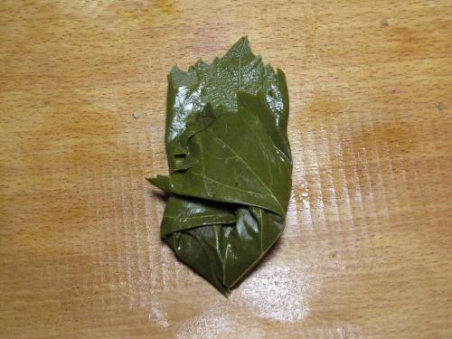 9. Начинаем заворачивать. Присмотритесь - виноградный лист напоминает ладонь. Вот и будем брать начинку в кулак. Очередность пальчиков такая: мизинец,